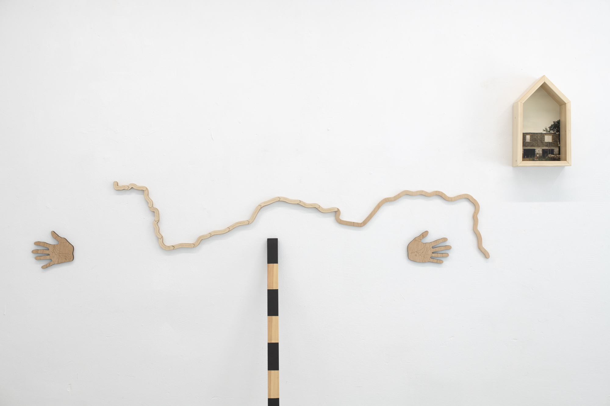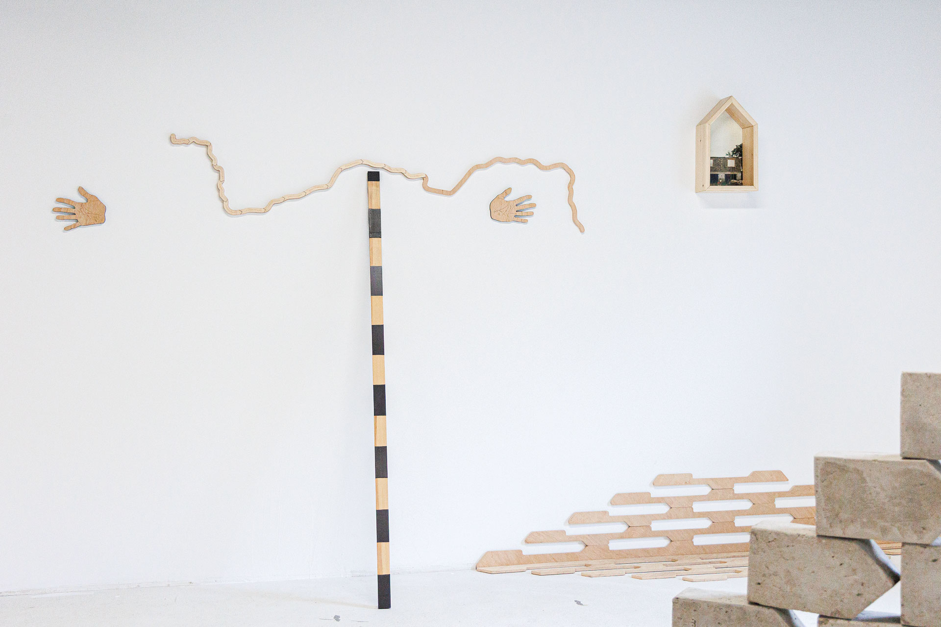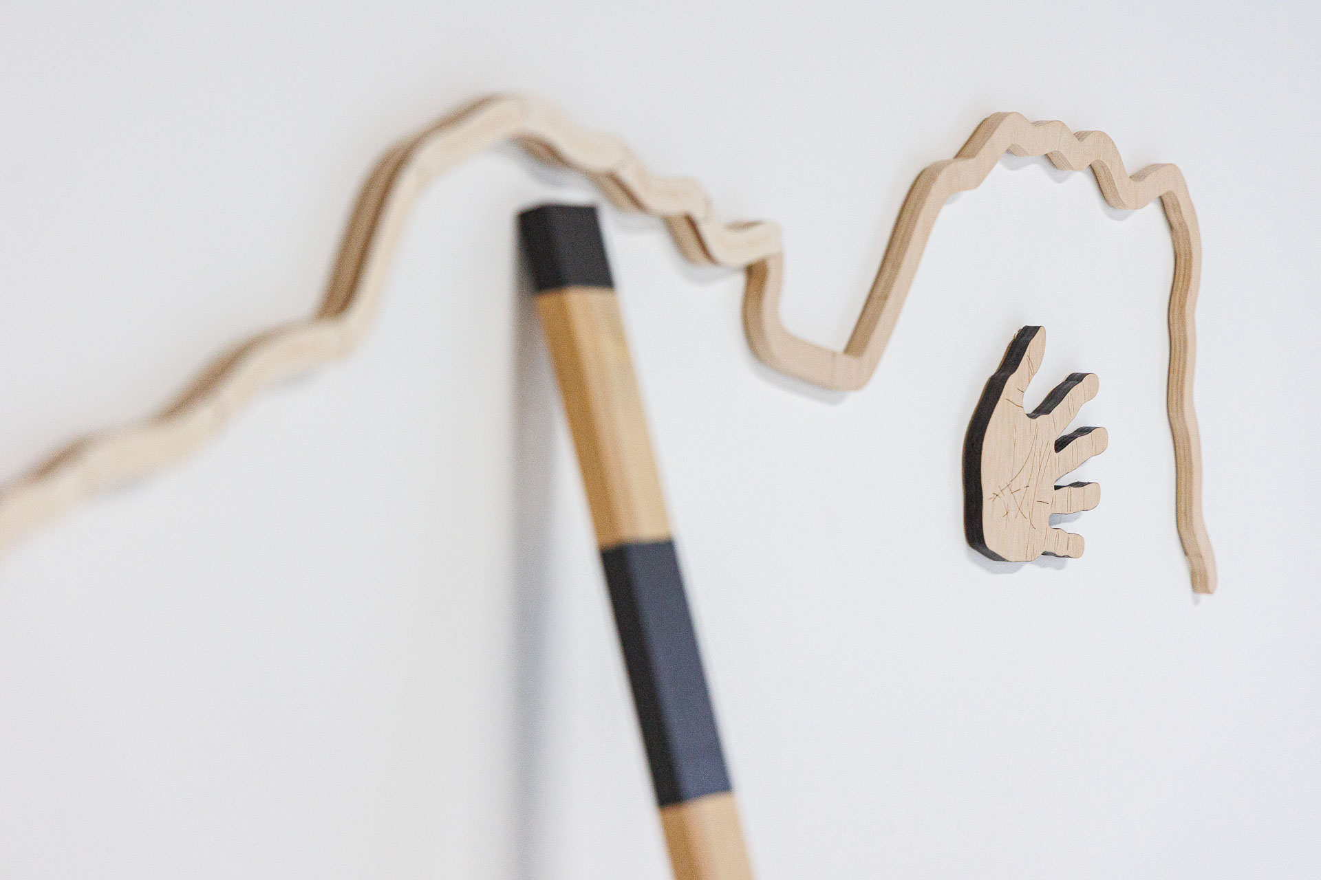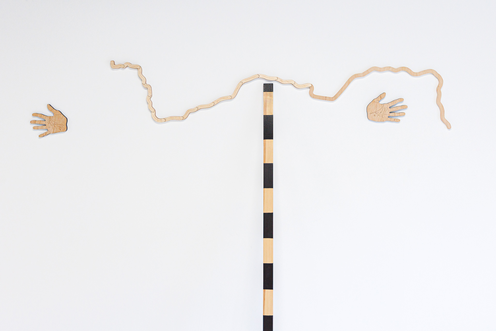 The linear path is interrupted by a reflective zone where space opens for confronting the legacy of the past and questioning internalized structures. A measuring rod leaning against the wall recalls the visual form of old school meter sticks, yet its length differs from theirs: it measures 143 centimeters—exactly the span between my two arms when extended, and the same distance that separates the starting and ending points of the path mounted on the wall. In this way the two measurements symbolically correspond through a form of embodied experience, an internalized personal reference. This connection is further reinforced by hand forms cast from my own palms, on which the lines appear like fate lines, pairing visually with the winding life path that runs above them.