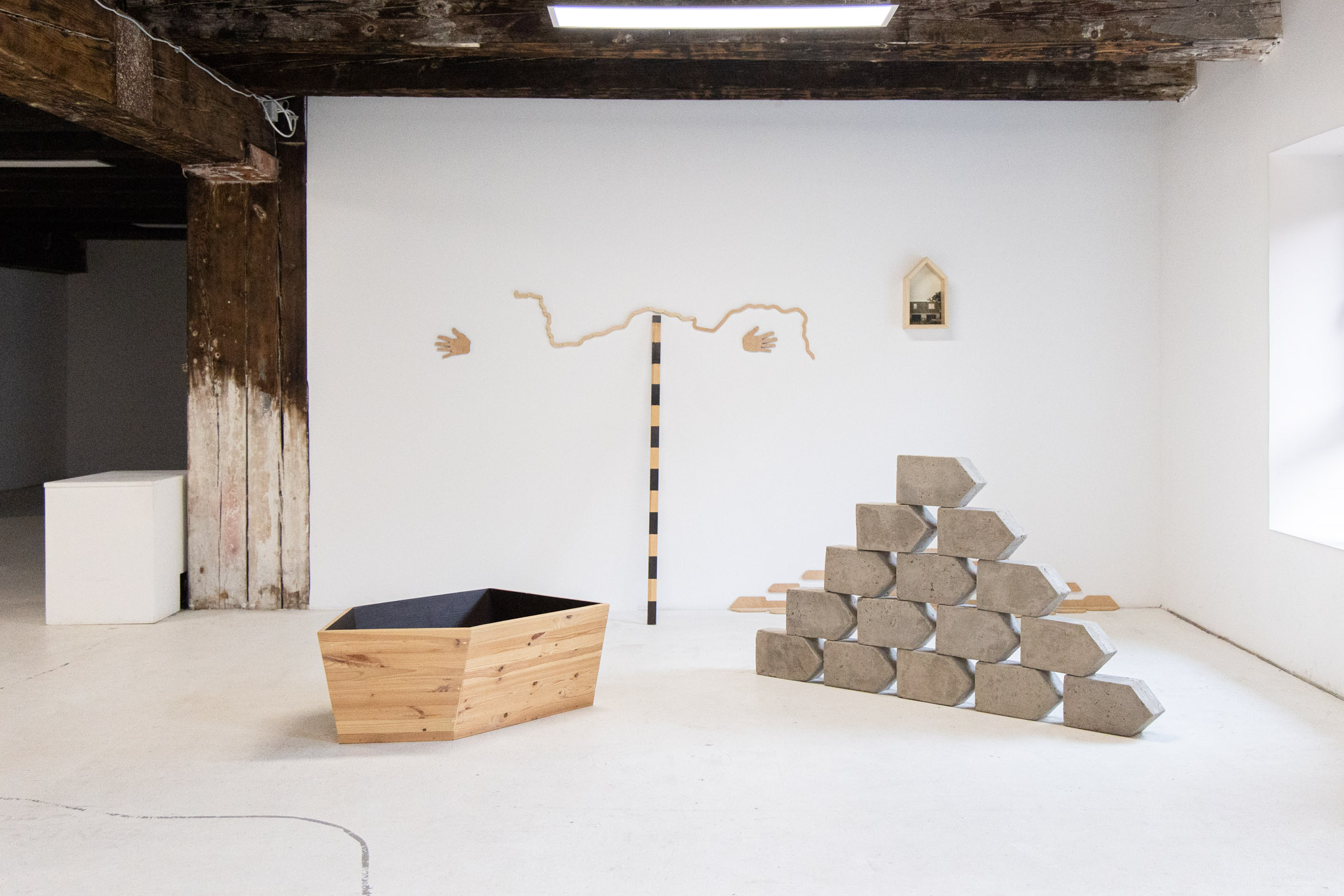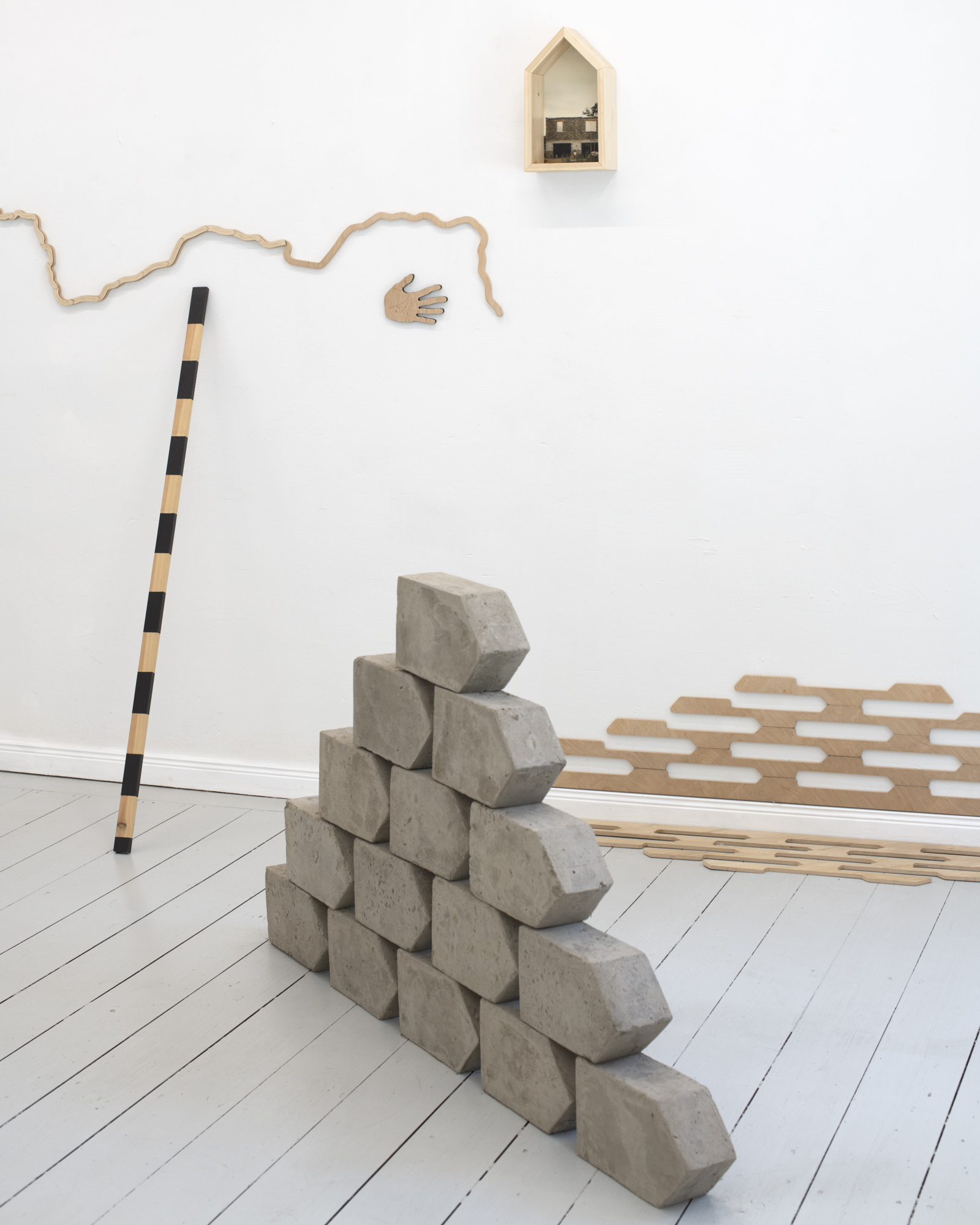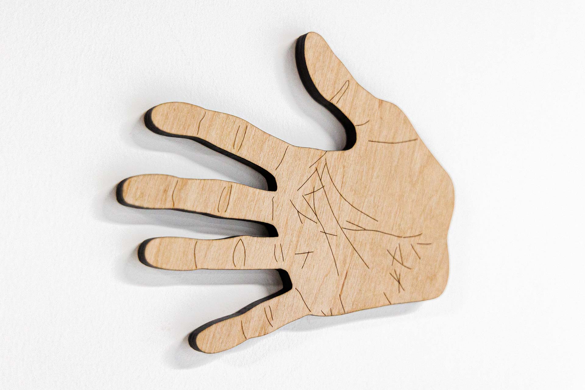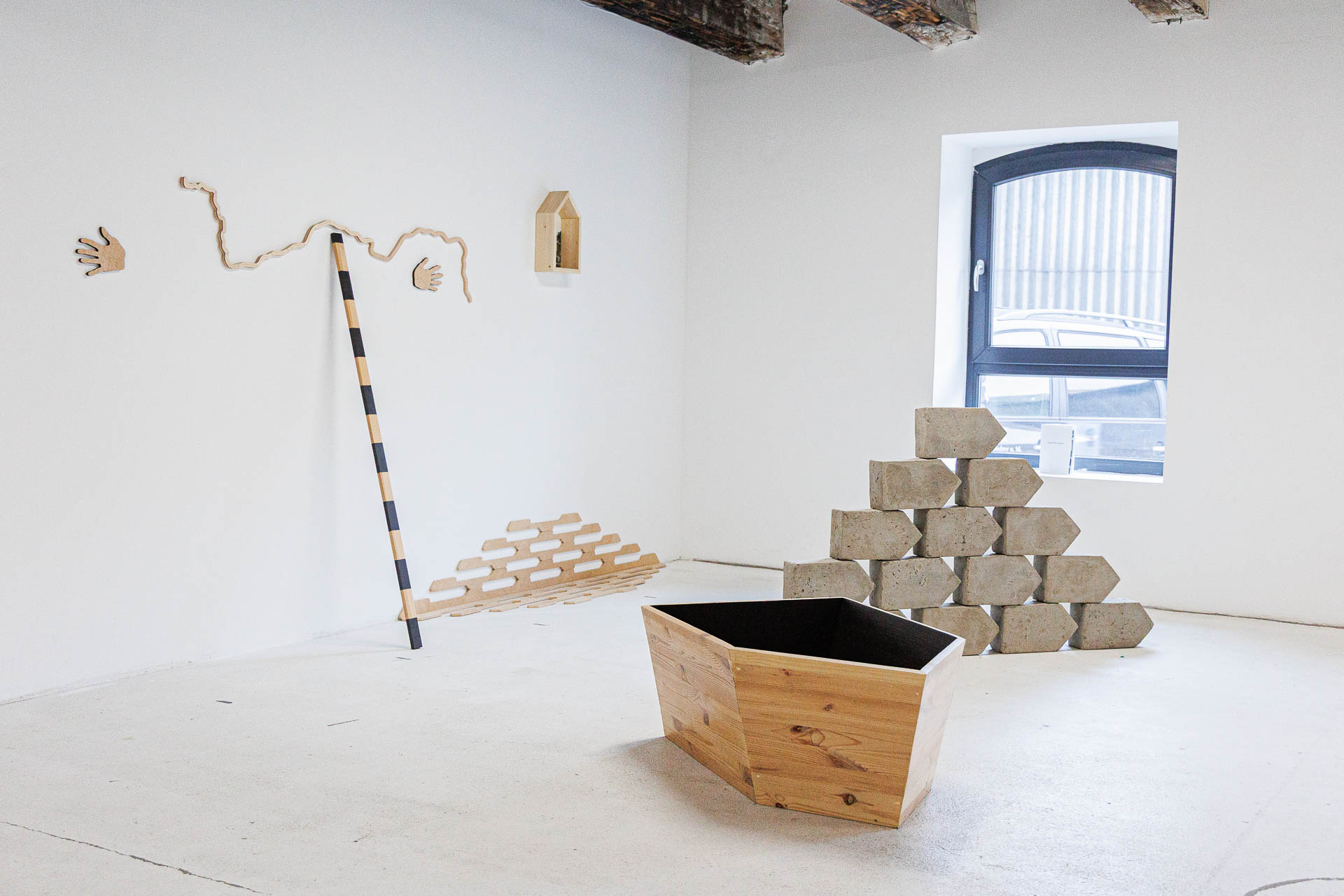 The linear path is interrupted by a reflective zone where space opens for confronting the legacy of the past and questioning internalized structures. A measuring rod leaning against the wall recalls the visual form of old school meter sticks, yet its length differs from theirs: it measures 143 centimeters—exactly the span between my two arms when extended, and the same distance that separates the starting and ending points of the path mounted on the wall. In this way the two measurements symbolically correspond through a form of embodied experience, an internalized personal reference. This connection is further reinforced by hand forms cast from my own palms, on which the lines appear like fate lines, pairing visually with the winding life path that runs above them.