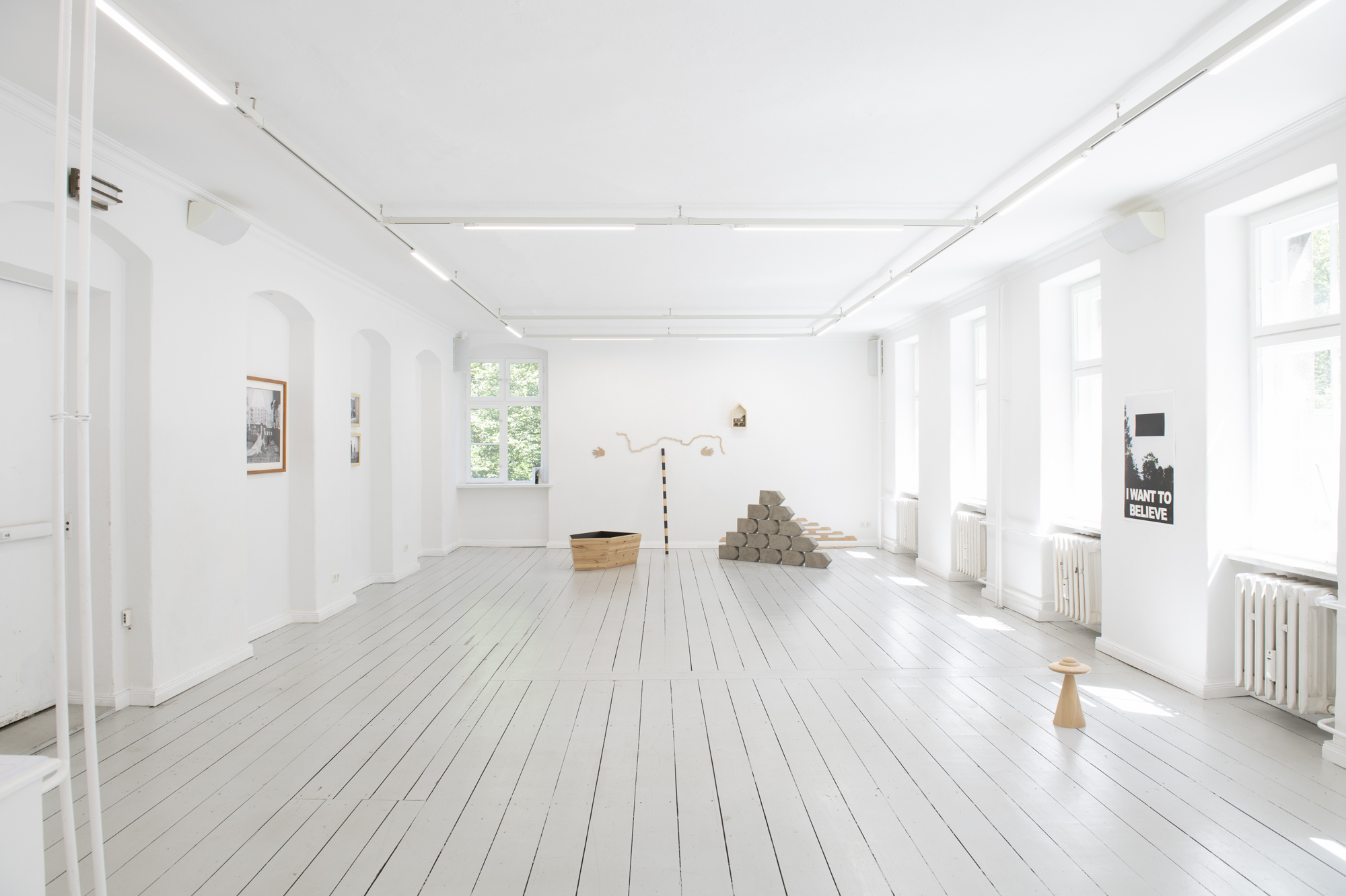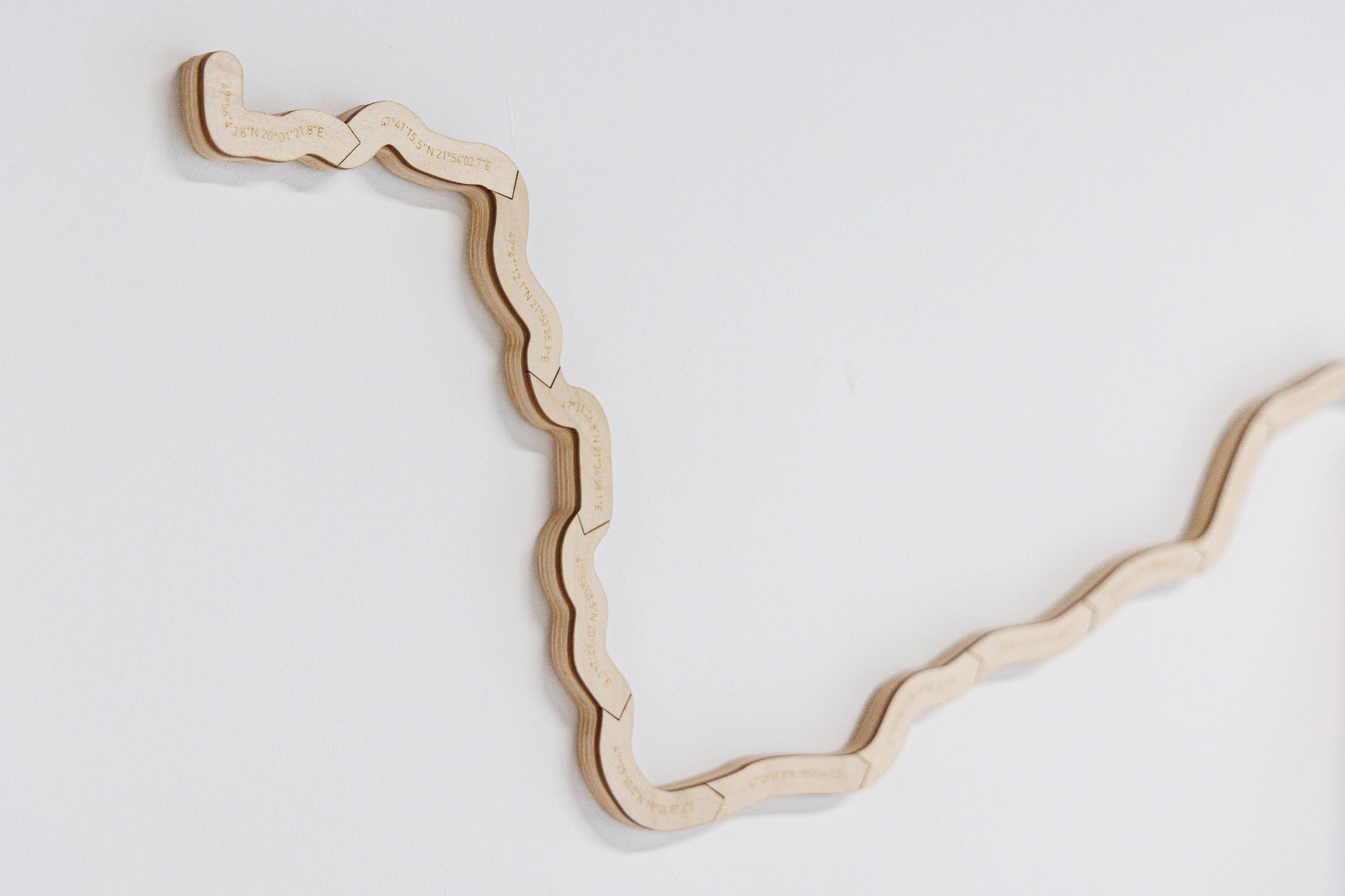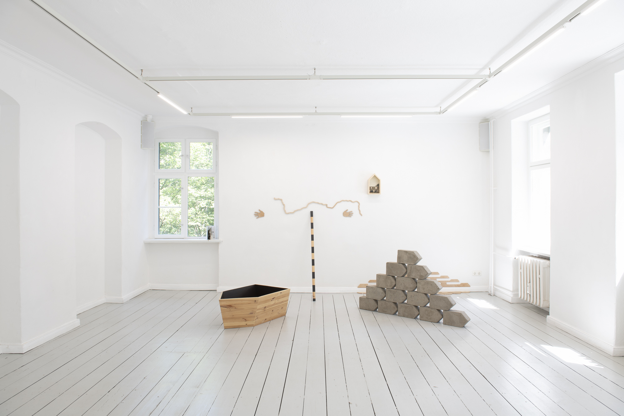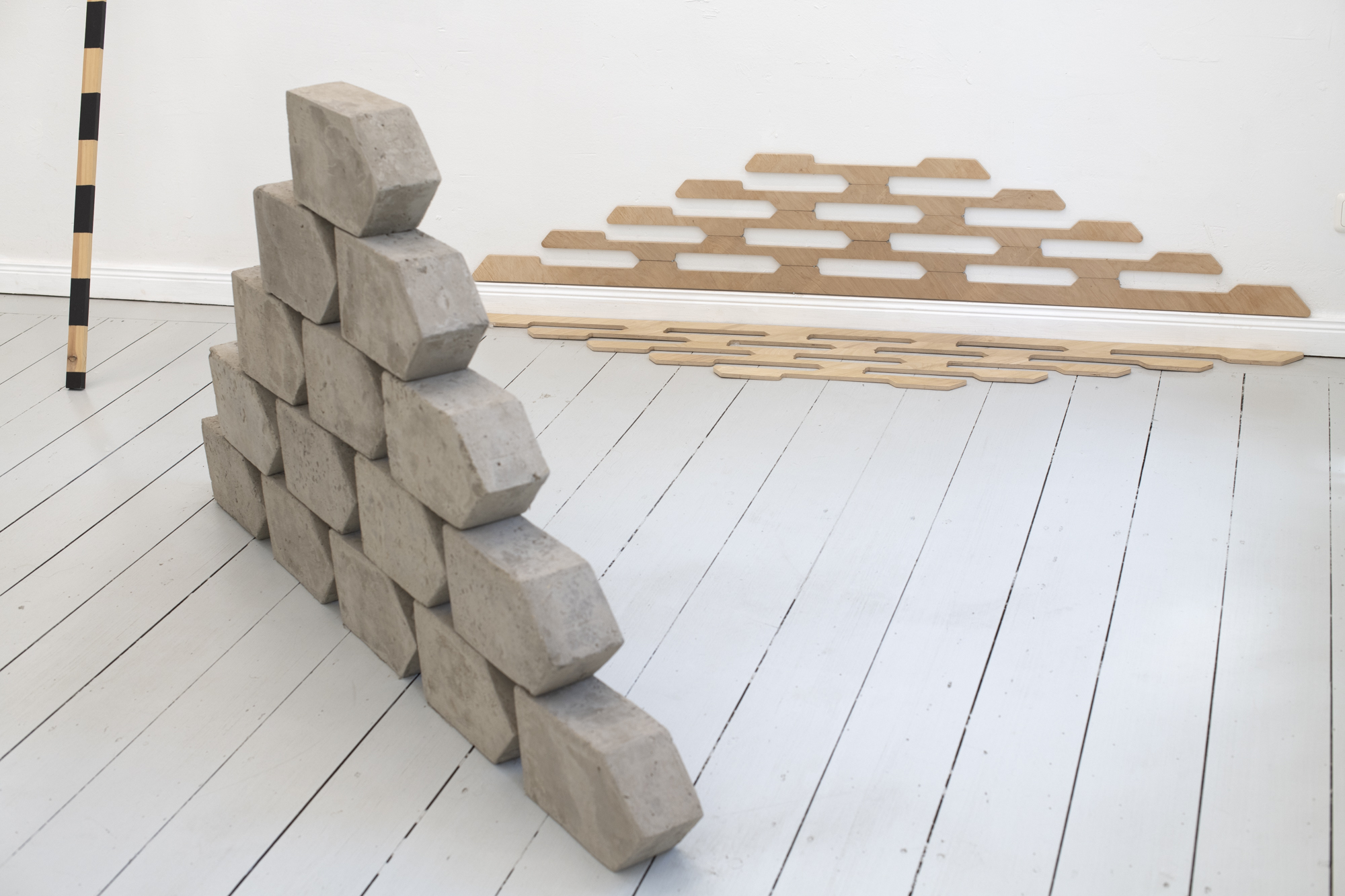 The linear path is interrupted by a reflective zone where space opens for confronting the legacy of the past and questioning internalized structures. A measuring rod leaning against the wall recalls the visual form of old school meter sticks, yet its length differs from theirs: it measures 143 centimeters—exactly the span between my two arms when extended, and the same distance that separates the starting and ending points of the path mounted on the wall. In this way the two measurements symbolically correspond through a form of embodied experience, an internalized personal reference. This connection is further reinforced by hand forms cast from my own palms, on which the lines appear like fate lines, pairing visually with the winding life path that runs above them.