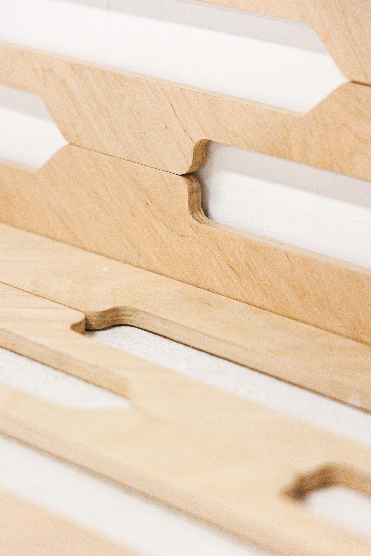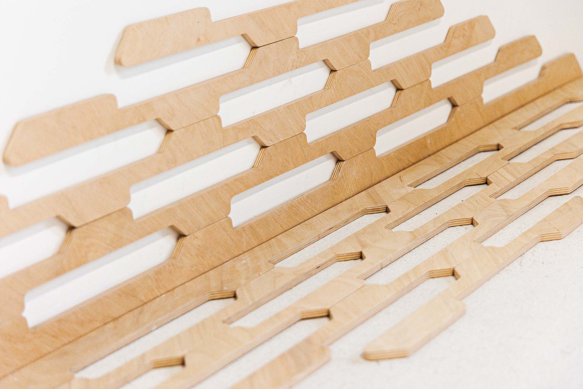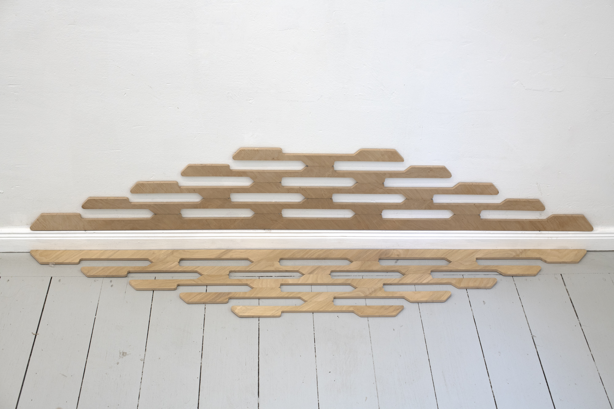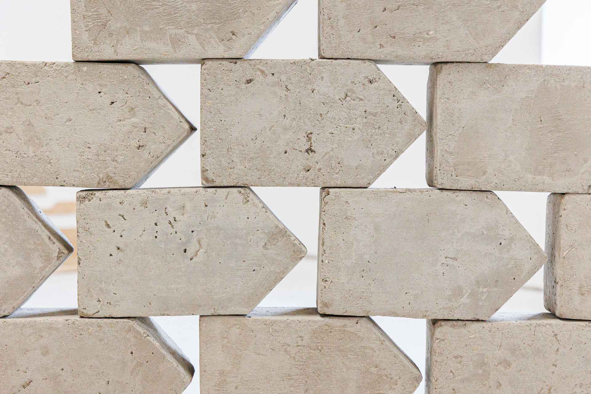 The linear path is interrupted by a reflective zone where space opens for confronting the legacy of the past and questioning internalized structures. A measuring rod leaning against the wall recalls the visual form of old school meter sticks, yet its length differs from theirs: it measures 143 centimeters—exactly the span between my two arms when extended, and the same distance that separates the starting and ending points of the path mounted on the wall. In this way the two measurements symbolically correspond through a form of embodied experience, an internalized personal reference. This connection is further reinforced by hand forms cast from my own palms, on which the lines appear like fate lines, pairing visually with the winding life path that runs above them.
