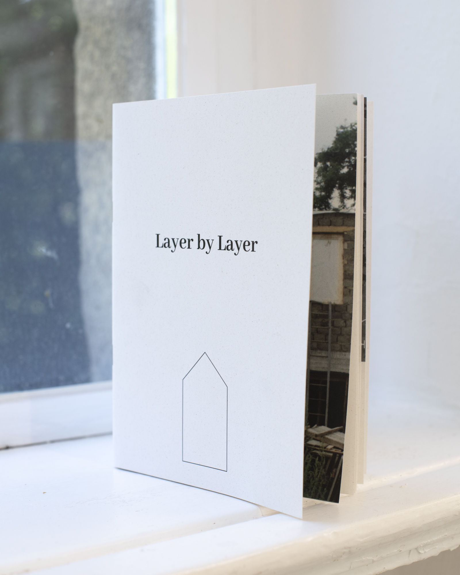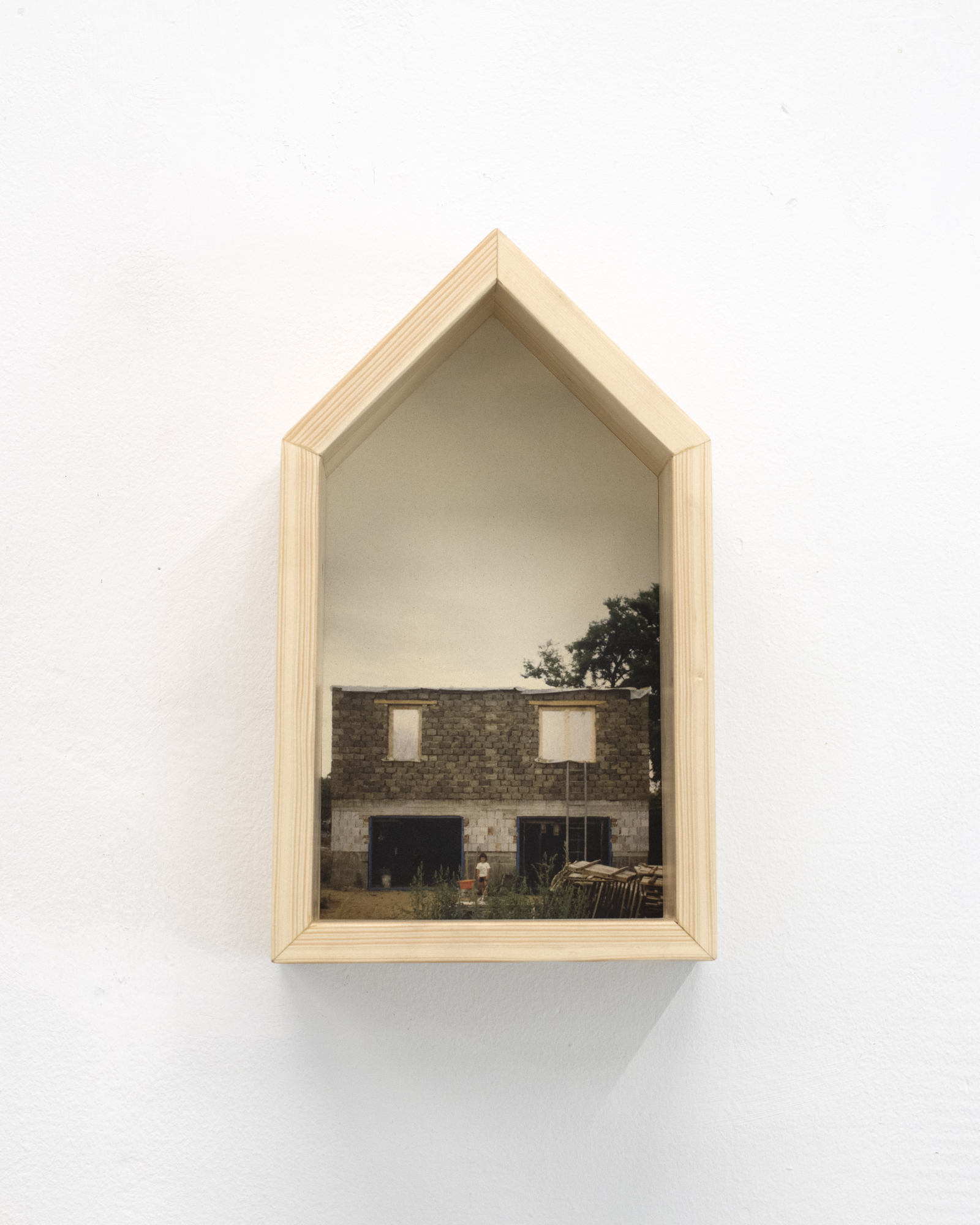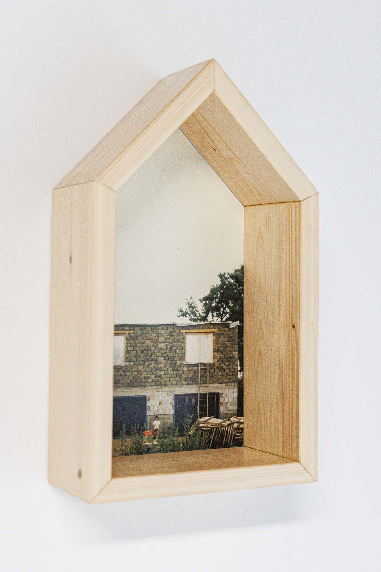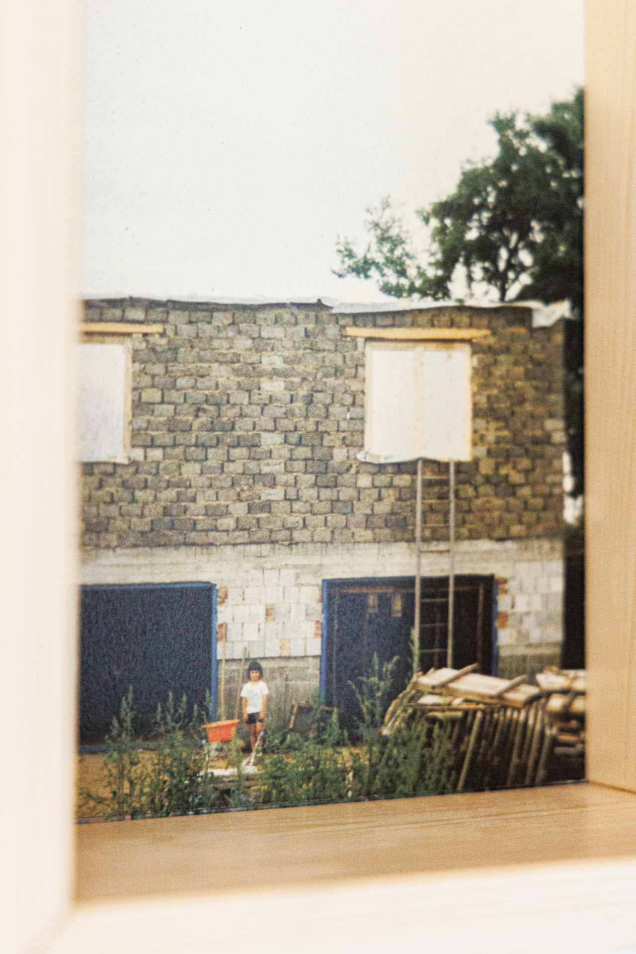 The winding path leads from loss toward construction, accompanied throughout by the neoliberal promise embedded in the belief in meritocracy—that hard work will ultimately bear fruit—even if the length of the distance, the fragmented nature of the route, and the instability of the bricks subtly reveal the fragility of this promise. Yet the focal point of the installation shifts the interpretation toward a more affirmative reading. A seed-mould fixed to the wall, together with a family photograph from 1995 placed behind it—showing me as a small child standing in front of our house under construction—emphasizes the home that was built collectively through communal effort. In this way the memory image highlights the possibility of renewal at the intersection of personal history and collective experience.