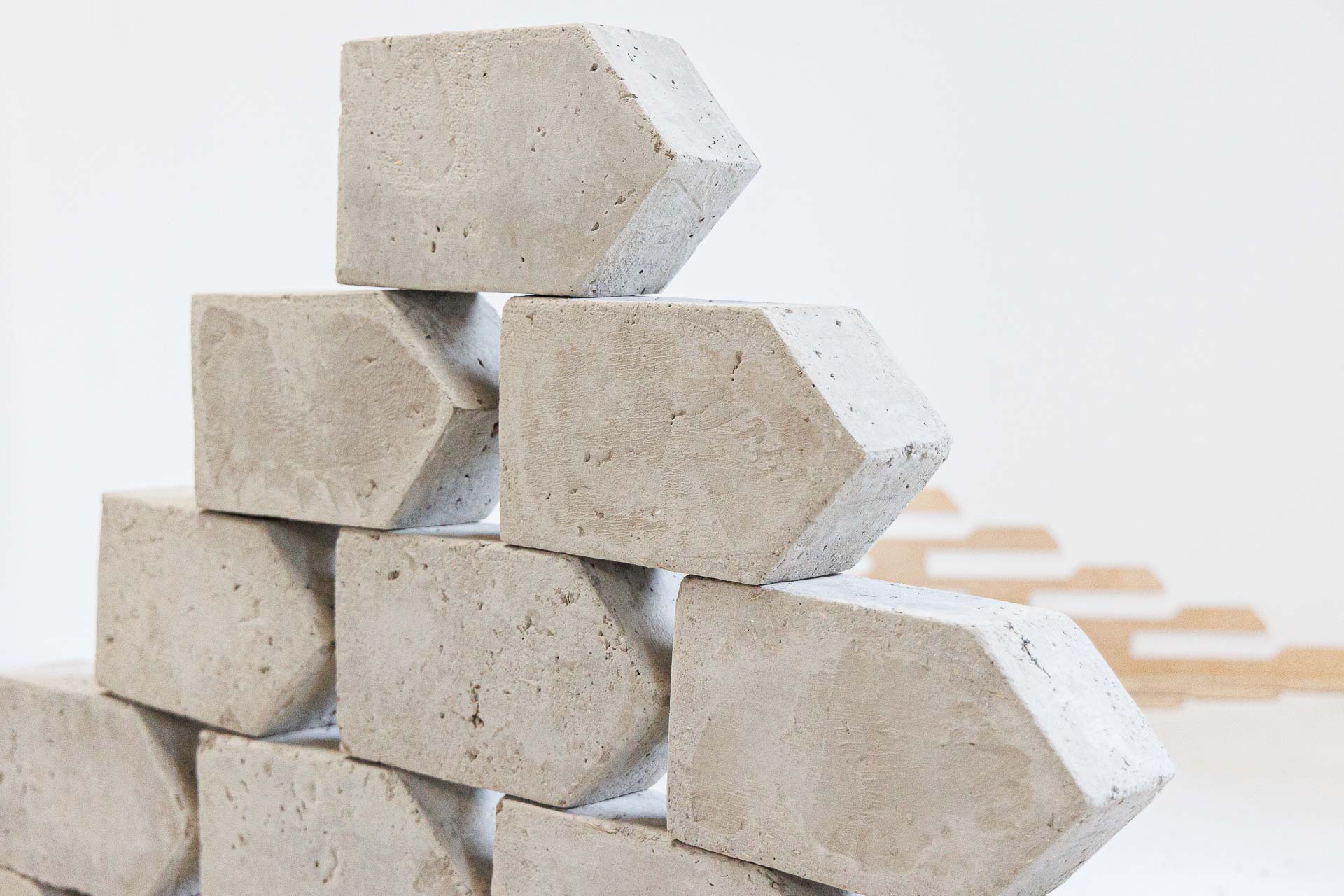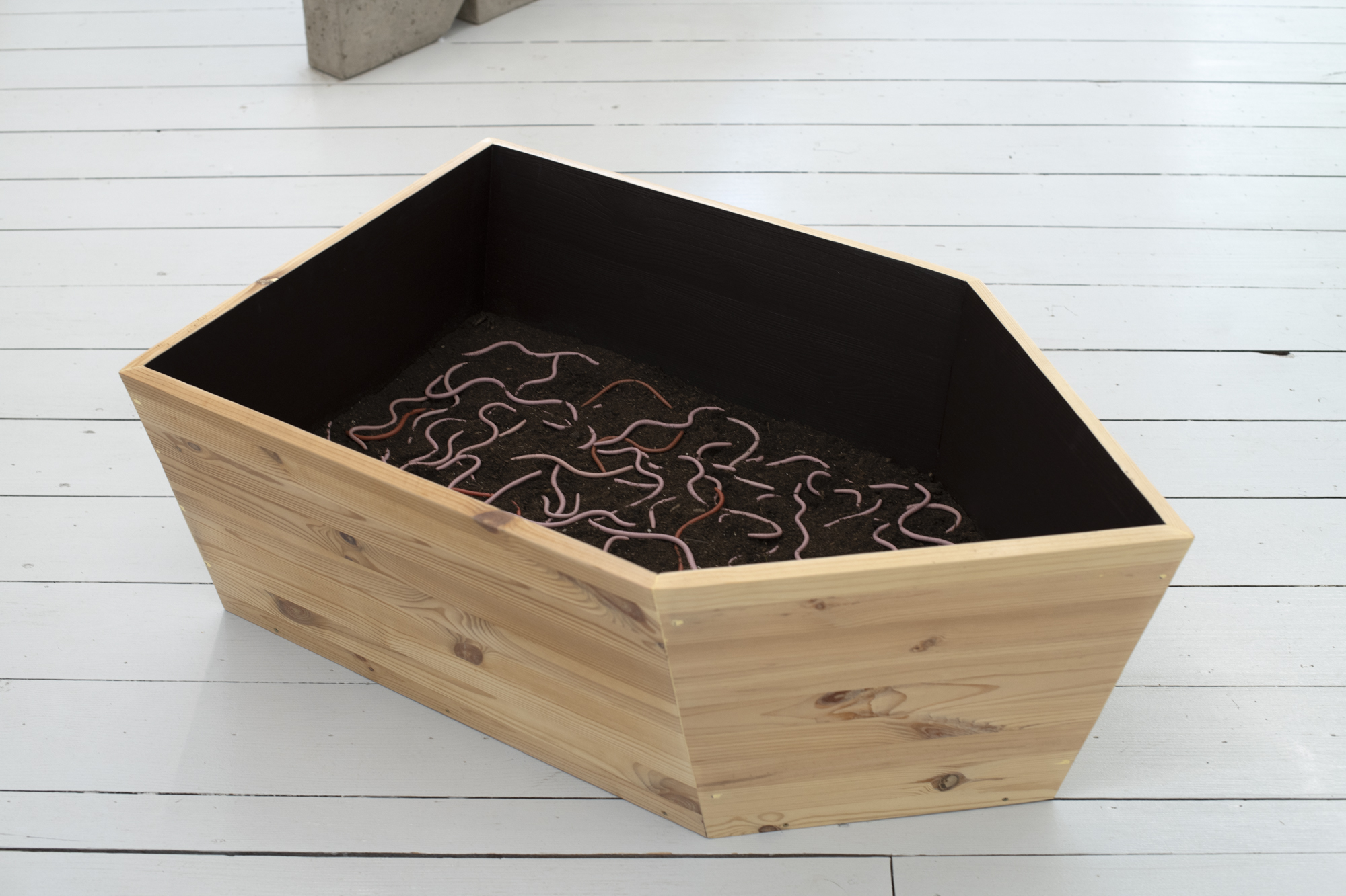 On the left side stands a worm-compost container whose form simultaneously evokes a cradle, a coffin, and a home, referring to a period of family trauma: the death of my grandfather, the loss of the house, and my own birth. On the right, in the foreground, fifteen adobe bricks—recycled from leftover building materials from our family house—are stacked in a pyramid-like arrangement. These house-shaped modules represent the fifteen homes where I have lived during the past thirty-four years, which also appear in the form of geographical coordinates along the path placed in the center.