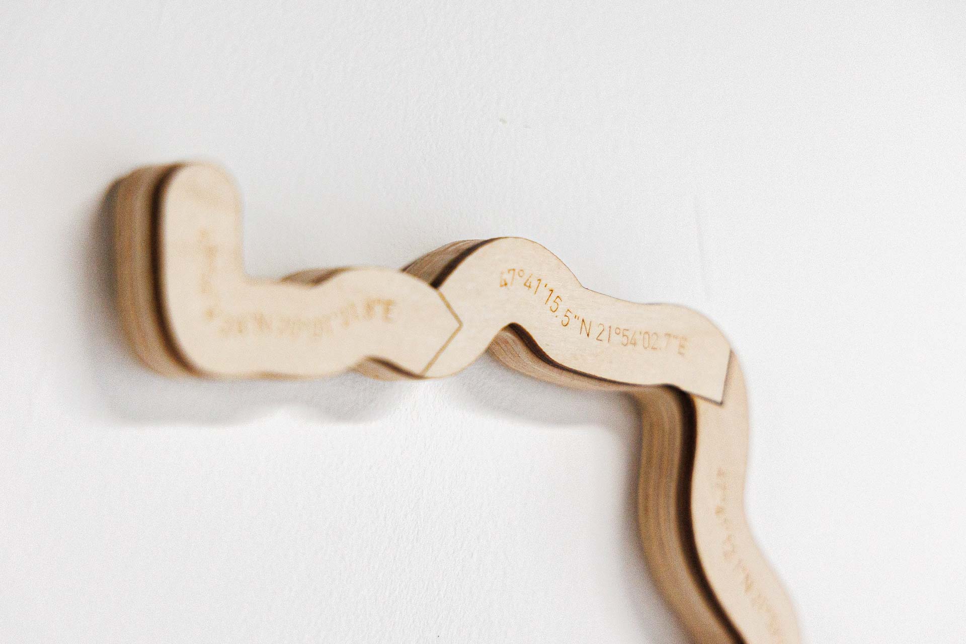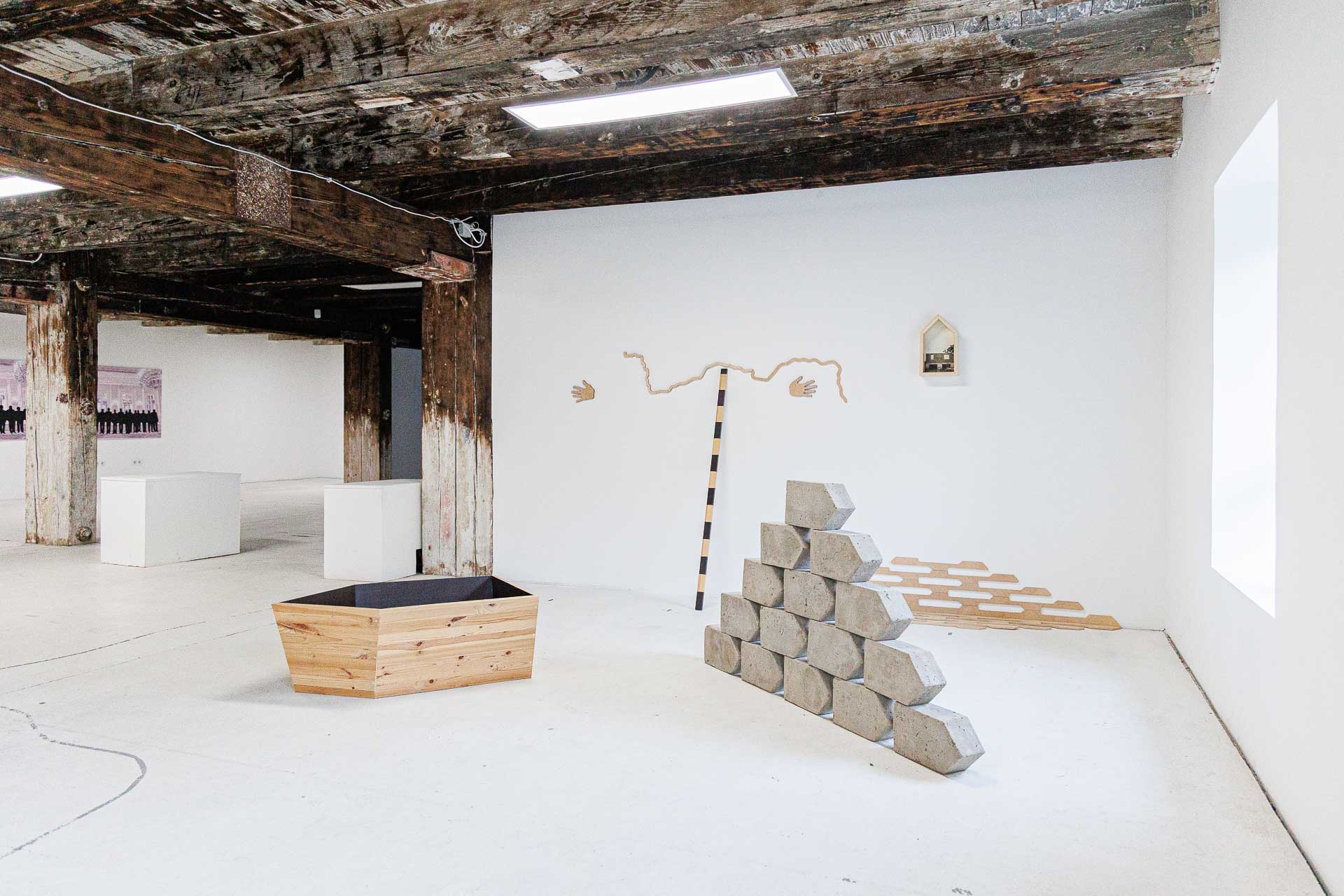 The work connects two family stories from the 1990s—the loss of our first house following the collapse of the bio-worm business, and the later construction of our adobe house, built collectively and financed through the Hungarian housing subsidy system (szocpol)—with the contemporary issue of the housing crisis through my own life trajectory. The installation bridges past and present events through the interconnection of various visual symbols and concepts. This arc also appears physically in the space, in the form of a miniature version of the route between the two houses—the one that was lost and the one that was built.